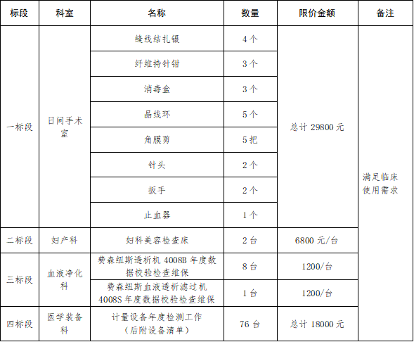 一、项目信息 根据临床科室开展业务需要及设备年度维保检测需求,现对以下内容进行公开议价采购,欢迎符合条件的供应商报名参与:  本次项目资金来源为自筹资金。 二、供应商资格要求 1.具有独立法人资格,经营范围符合采购需求; 2.供应商须具备有效的《医疗器械生产许可证》或《医疗器械经营许可证》(二类产品可提供备案凭证,不作为医疗器械管理的可不提供);供应商所投标货物需提供有效的医疗器械产品注册证或备案凭证(不作为医疗器械管理的可不提供) 3.近三年无重大违法记录及行业不良信用记录; 4.凡列入失信被执行人、重大税收违法失信主体、政府采购严重违法失信行为记录名单及其他不符合《中华人民共和国政府采购法》第二十二条规定条件的潜在投标人禁止投标,投标人须提供网页截图。(信用记录查询渠道:“信用中国”网站(www.creditchina.gov.cn)或中国政府采购网(www.ccgp.gov.cn)); 5.须提供无行贿犯罪记录承诺函(查询对象包括企业、企业法定代表人、委托代理人),并对其真实性负责,格式自拟,若承诺不实,造成的后果由投标人自行负责; 三、报名及议价安排 1.报名时间:2025年10月28日—10月30日(工作日8:30-12:00,14:30-17:30) 2.议价材料:营业执照、医疗器械经营许可证复印件(加盖公章);产品技术参数、授权书及报价单(密封提交,一式三份);售后服务承诺书,提交至医院行政楼四楼招采办公室。 3.议价时间:2025年11月3日上午11:00 4.议价地点:医院行政楼3楼会议室 5.联系人:刘鹏 联系电话:18838686975 四、注意事项 1.计量设备清单https://www.nyyzsfy.cn/uploads/20251028/aa84428a06a6d3293b63104c9ef26632.pdf 2.供应商须按科室需求报价,允许仅参与部分项目。 3.报价包含运输、安装、培训等一系列费用,投标方在医院进行安装、调试、培训时所属人员人身、财产安全由投标方负责,院方不承担任何民事、刑事及连带责任。 4.我院不组织现场勘查,对工作要求如有疑问,可自行组织勘查。 5.未按时到场参与询价者视为自动放弃。 6.中选原则:同等条件下,报价最低且符合技术要求的供应商优先。 7.若双方服务内容、价格协商不成功,按流标处理。 8.本次采购解释权归南阳医专第三附属医院所有。 南阳医专第三附属医院 2025年10月28日 上一篇:南阳医学高等专科学校第三附属医院省医保一码付平台接口改造技术服务及影像云平台接口升级技术服务成交公告